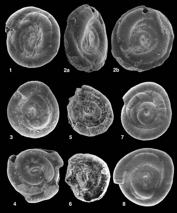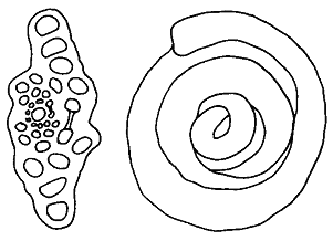 Fig. 25-2. Cross section through Glomospira gordialis, revealing the high trochospiral initial coiling, redrawn after Bender (1995) ILLUSTRATIONS: Plate 25 - Glomospira gordialis (Jones & Parker) Fig. 1. Recent, Mediterranean, Lectotype from the Parker Collection (BMNH Slide no ZF 4876, ex Slide 1894.4.3.540); Fig. 2a,b. Recent, Mediterranean, Paralectotype from the Parker Collection, (BMNH Slide no. ZF 4877, ex Slide 1894.4.3.709); Fig. 3. Recent, Hatteras Abyssal Plain; Fig. 4. Recent, Hatteras Abyssal Plain; Fig. 5-6. Late Miocene, ODP Site 646, Labrador Sea, Sample 646A-77R-5, 25-27 cm; Fig. 7-8. Early Eocene, ODP Site 647, Labrador Sea, Sample 647A-65R-1, 31-34 cm.