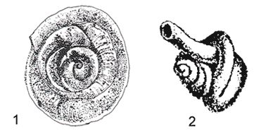 Fig. 25. 1- Lectotype of G. gordialis from the Parker Collection, redrawn from an SEM photograph. 2- earliest figure of G. gordialis, from Carpenter et al. (1862). ORIGINAL DESIGNATION: Trochammina squamata Jones & Parker var. gordialis Jones & Parker, 1860. TYPE REFERENCE: Jones, T.R. & Parker, W.K. 1860. On the Rhizopodal fauna of the Mediterranean compared with that of the Italian and some other Tertiary deposits. Quarterly Journal of the Geological Society of London, 16, 292-307 (no type figure given). The earliest figure was given by Carpenter et al. (1862), pl. 11, fig. 4 (reproduced above). See also: Berggren, W.A., & Kaminski, M.A. 1990. Abyssal Agglutinates: Back to Basics. In: Hemleben, C., Kaminski, M.A., Kuhnt, W., and Scott, D.B., (Eds.), Paleoecology, Biostratigraphy, Paleoceanography and Taxonomy of Agglutinated Foraminifera, NATO ASI Series C-327, Kluwer Acad. Publ. 53-76. pl. 1, fig. 1 [Lectotype]. TYPE SPECIMEN: Deposited in the micropaleontological collections of the British Museum (Natural History). In his manuscript catalog of the W.K. Parker Collection, T.R. Jones identified two slides containing "Ammodiscus gordialis". The samples which yielded these specimens were collected in 1859, therefore, the specimens are syntypes. The lectotype (ZF 4876) designated by Berggren & Kaminski (1990) and given here (pl. 25, fig. 1), is from Slide 1894.4.3.540. Metatypes are housed in Slide 1894.4.5.709. TYPE LEVEL: Recent. TYPE LOCALITY: not originally designated. In the original description, Jones & Parker (1860) reported this taxon from the Indian Ocean and Arctic seas. No locality was specified for the specimen illustrated by Carpenter et al. (1862), and we did not find this specimen in the W.K. Parker Collection. The specimens in the W.K. Parker Collection are from two stations in the Mediterranean. The lectotype specimen is from the H.M.S. Firebrand dredge sample collected off Gozo Island, Malta (see type locality of G. charoides). The other sample is from a dredging collected by Capt. J.A.B. Spratt in 170 fathoms off Serpho Island in the Greek Archipelago. DIAGNOSTIC FEATURES: Test comprised of a globular proloculus followed by an undivided tubular second chamber that is at initially coiled in a high trochospiral manner about the proloculus, forming a single layer of coils that completely envelop the proloculus as in G. charoides, later coiled glomospirally about a common plane, usually in 5 or 6 whorls. Coiling in the glomospiral portion of the test is open, not enrolled, and the umbilical region is usually visible and is depressed. The terminal part of the tube may be coiled somewhat irregularly. Wall imperforate, finely agglutinated, with undifferentiated organic cement and an inner and outer organic lining, smoothly finished. Aperture at the open end of the tube. Modern specimens are light brown in color. SIZE: Diameter of lectotype: 28 mm along major axis, 30 mm along minor axis. Diameter of tube in the last whorl: 60 microns. Paralectotypes are 25 - 37 mm along the major axis. Cushman (1918) reported specimens up to 90 mm in diameter. SYNONYMS: None verified. OBSERVED OCCURRENCES: Glomospira gordialis has been reported from Cretaceous to Recent deep-water sediments from throughout the world ocean. In the modern deep ocean it is the dominant species of Glomospira. It is widely distributed, but usually occurs in low numbers. Brady (1884) reported this species from 27 CHALLENGER stations ranging in depth from 50 to over 2,000 fathoms, and noted that it was also present in the polar stations. Cushman (1918) recorded it from 10 ALBATROSS stations in the North Atlantic from 167 to 1608 fathoms. In the Southern Ocean, Earland (1934) reported it to be widely distributed from 262 to 4845 m, but most common at deeper stations. Lukina (1980) observed it between 3095 and 7560 m in the central Pacific (Hawaii, Gilbert & Marshall Islands, and the Tonga Trench). Glomospira gordialis occurs in low abundance on the Newfoundland and Nova Scotian continental slopes (Cole, 1981; Schröder, 1986), but is the only species of Glomospira present in our samples from the Nares and Hatteras abyssal plains. Jonasson et al. (1995) reported increased abundance of G. gordialis in sulphide-containing "hydrothermal muds" in the proximity of active hydrothermal vents in the Juan de Fuca Ridge. It is also a component of the lower Campanian and lower Eocene "Glomospira facies" in the North Atlantic and Western Tethys. KNOWN STRATIGRAPHIC RANGE: Late Cretaceous to Recent. BATHYMETRY: Bathyal to abyssal. Cushman (1918) reported it from stations as shallow as 167 fathoms in the North Atlantic. Pflum & Frerichs (1976) listed its upper depth limit at around 400 m in the Gulf of Mexico. REMARKS: Glomospira gordialis is today regarded as one of the best known species of agglutinated foraminifera. It has been cited by more authors than we would care to count. However, when the detailed history of this taxon is closely examined, one is confronted with the author's changing taxonomic concepts, the lack of designated types, and a misleading original illustration by Carpenter et al. (1862), which has led to the imprecise definition of the genus Glomospira by Loeblich & Tappan (1987). Because Carpenter's figure does not conform to the modern concept of the species, and because T. squamata var. gordialis is the type species of Glomospira, it is necessary to carefully review the authors' original species concepts. Jones & Parker (1860) described Trochammina squamata var. gordialis as follows: "Trochammina squamata comprises five varieties which are spiral, and more or less Rotalian in their growth. (...) The third variety, Trochammina squamata gordialis (from the Indian and Arctic Sea), has more than one chamber, the shell at the early stage being formed of a few spirally arranged but variable chambers; and at a later period being moulded on an undivided, vermiform sarcode, either discoidal or irregularly elevated; so