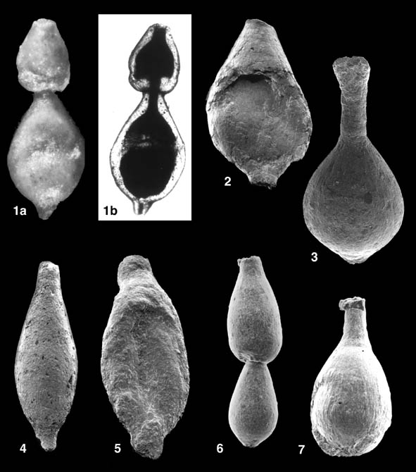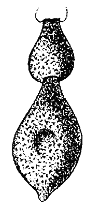 Fig. 42. Lectotype of Reophax ovuloides, from Grzybowski (1901) ORIGINAL DESIGNATION: Reophax ovuloides Grzybowski, 1901 TYPE REFERENCE: Grzybowski, J., 1901, Otwornice warstw inoceramowych okolicy Gorlic. Rozprawy Wydziału Matematyczno-Przyrodniczego, Akademia Umiejętności w Krakowie, serya 2, vol. 41, p. 223, pl. 8, fig. 3. See also: Kaminski, M.A. & Geroch, S., 1993. A revision of foraminiferal species in the Grzybowski Collection. Grzybowski Foundation Special Publication, 1, 239-323, pl. 15. fig. 5a,b [Lectotype]. TYPE SPECIMEN: Not originally designated. A lectotype was disignated by Kaminski & Geroch (1993; pl. 15, fig. 5). This specimen was illustrated by Grzybowski (1901; pl. 8, fig. 3), and is preserved in the micropaleontological collections of the Jagiellonian University, Kraków, (no. UJ-133-P 2/30). TYPE LEVEL: The lectotype specimen is from Paleocene variegated shales overlying the Inoceramian beds, Magura tectonic unit of the Polish Carpathians. TYPE LOCALITY: The lectotype is from the Rogoyski well (30 m depth) at Michalówka, in the village of Siary, near Gorlice Poland. DIAGNOSTIC FEATURES: Test free, pseudomultilocular, comprised of two or more rounded, pyriform or elongated pseudochambers without true internal partitions, connected by relatively thick, but short, tubular stolons. Wall thick, imperforate, finely agglutinated, usually well-silicified. Aperture at the open end of the tube at one or both ends of the test. SIZE: The lectotype specimen is 1.09 mm in length. Single chambers may be up to 0.90 mm in length. SUSPECTED SYNONYMS: None verified. OBSERVED OCCURRENCES: Caudammina ovuloides was originally reported by Grzybowski (1901) as Reophax ovuloides from the Paleocene of the Polish Carpathians. Subsequent authors have either reported it as Hormosina ovuloides or combined it with Caudammina ovulum. It was recorded from the Paleogene of the Polish Carpathians (Jednorowska, 1975). Hanzlíková (1969, 1972) reported it from the Maastrichtian Frydek Formation and the Maastrichtian to Paleocene Istebna beds in Moravia; and Samuel (1977) recorded it from the Upper Cretaceous to Paleocene Inoceramian, Cisna, and Proc beds of the Carpathians in eastern Slovakia. De Klasz & De Klasz (1990) illustrated a specimen from the Danian of the Buntmergelserie in Bavaria. Beckmann (1994) reported it as Hormosinella ovulum from the mid Paleocene of Trinidad. KNOWN STRATIGRAPHIC RANGE: ?Turonian - early Middle Eocene. Not observed above the Paleocene in the Atlantic region south of the Greenland-Scotland Ridge. BATHYMETRY: Bathyal to abyssal. REMARKS: Caudammina ovuloides differs from Caudammina ovula in possessing more pyriform chambers which taper towards the tube, and in having a connecting tube that is thicker, more robust, and shorter in proportion to the diameter of the test. In this respect, it is closer in morphology to the Recent species Reophanus oviculus (=Hormosina ovicula Brady, 1879). The length of the connecting tube is variable. Multichambered specimens of C. ovuloides are occasionally found, whereas in C. ovula the connecting stolon invariably breaks. Specimens of C. ovuloides from Zumaya Spain have a slightly coarser wall than specimens from other studied localities. ILLUSTRATIONS: Plate 42 - Caudammina ovuloides (Grzybowski) Fig. 1a-b. Paleocene, Siary Poland, Magura Unit of the Polish Carpathians, Lectotype; Fig. 2. Paleocene, Szklary Poland, Skole Unit of the Polish Carpathians; Fig. 3. Campanian, Węglówka Poland, Subsilesian Unit of the Polish Carpathians; Fig. 4. Paleocene, DSDP Site 112, Labrador Sea, Sample 112-16R-1, 85-87 cm; Fig. 5. Paleocene, Zumaya Spain; Fig. 6. Lower Paleocene, "Scaglia Rossa" facies, beach outcrop in Sopelana Spain; Fig. 7. Lower Paleocene, Lizard Springs Formation of Trinidad, well G-163, 4566'.