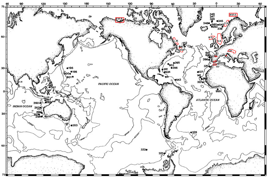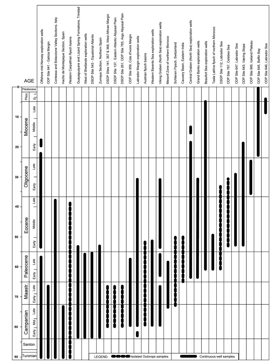 Altogether, the studied localities span the stratigraphic interval from the Upper Cretaceous through the Pliocene, with emphasis on the Paleogene. Ten of the studied DSDP and ODP sites are in the abyssal realm, including ODP Site 641, Galicia Margin, DSDP Site 543, Equatorial Atlantic, DSDP Site 137, Eastern Atlantic Abyssal Plain, DSDP Site 261, Argo Abyssal Plain, DSDP Site 112, Labrador Sea, ODP Site 767, Celebes Sea, ODP Site 647, Labrador Sea, ODP Site 643, Vøring Slope and ODP Site 985, Iceland Plateau. ODP Site 646 in the Labrador Sea is upper abyssal, above the CCD.