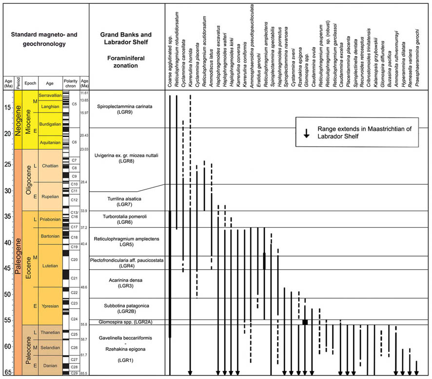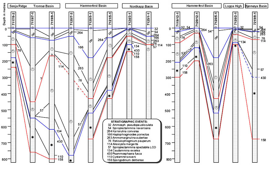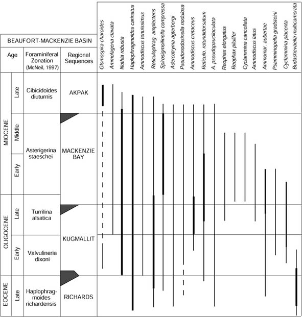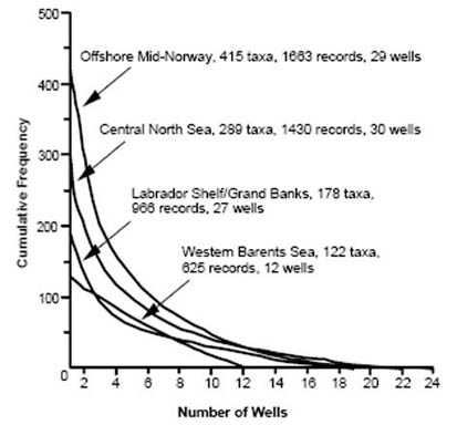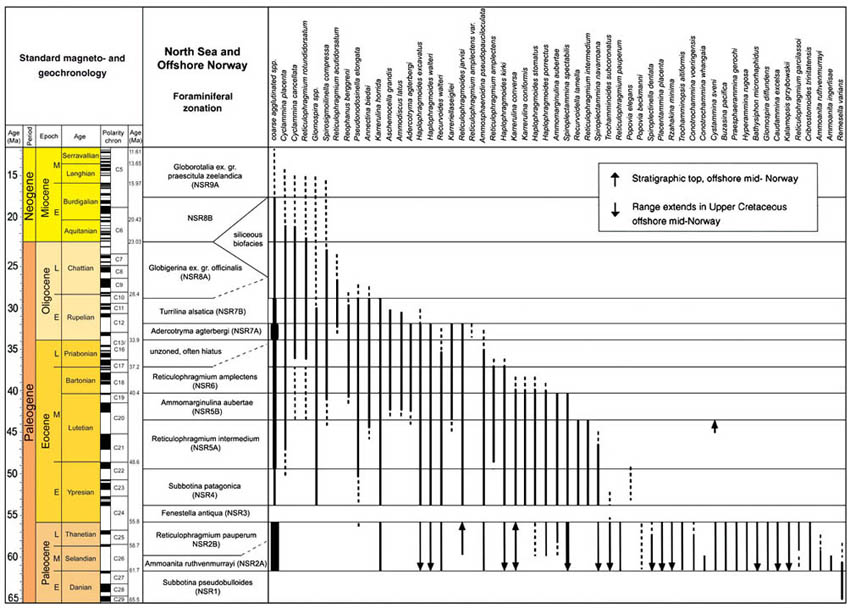 In the North Atlantic petroleum basins the proportions of "primitive Reticulophragmium" increased throughout the late Paleocene, culminating in an acme just below the Paleocene/Eocene boundary. The "Reticulophragmium pauperum Zone" in the North Sea, Norwegian Shelf, and Western Barents Sea encompasses this acme. Various species of "primitive Reticulophragmium" evolved independently from various Haplophragmoides ancestors, mostly during the mid- to late Paleocene. In the Atlantic sector, for example the Indian Harbour well, the dominant species is Reticulophragmium garcilassoi, whereas in the Norwegian Sea we find R. pauperum and a robust Reticulophragmium. The genus Reticulophragmoides first appeared in the mid-Paleocene in the Atlantic and Norwegian Sea. An interesting primitive form of Reticulophragmium with few alveoles is R. vidonioensis from the Vidoño Shale of eastern Venezuela (Kaminski & Crespo de Cabrera, 1999). Several seemingly endemic species such as Reticulophragmium arcticum and its relatives are observed in the Paleocene of the Alaskan offshore (Petracca, 1972), in the deltaic sediments of the Beaufort Sea (McNeil, 1997), and the Paleocene of Spitzbergen (Nagy et al. 2000).