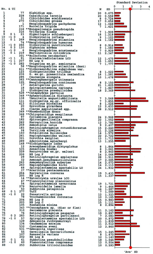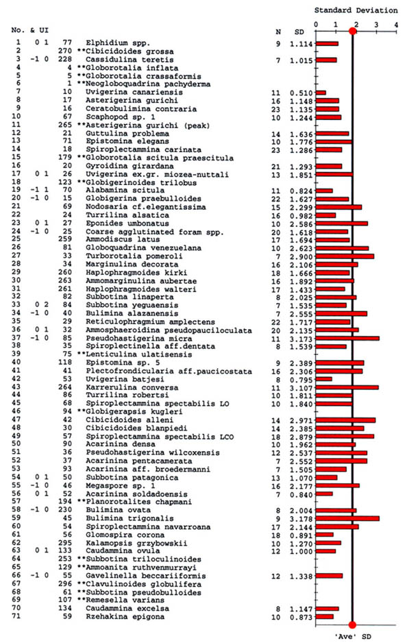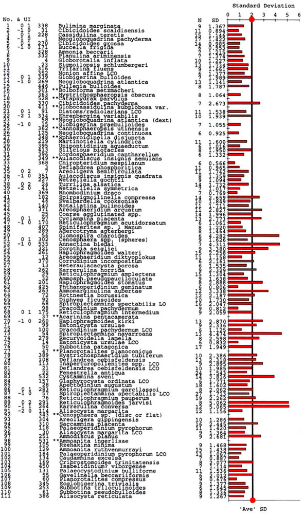 This Karrerulina event is curious, as we have also observed an acme of K. conversa in the upper part of the lower Eocene in the North Sea (Gradstein et al., 1994), and it is observed as far north as ODP Site 913 in the East Greenland Basin (see: Table 2 of Osterman & Spiegler, 1996). It occurs in Morocco (Kaminski et al., 1996) in more or less the same relative position. However, the latter areas the chronology of the event is not as well constrained.