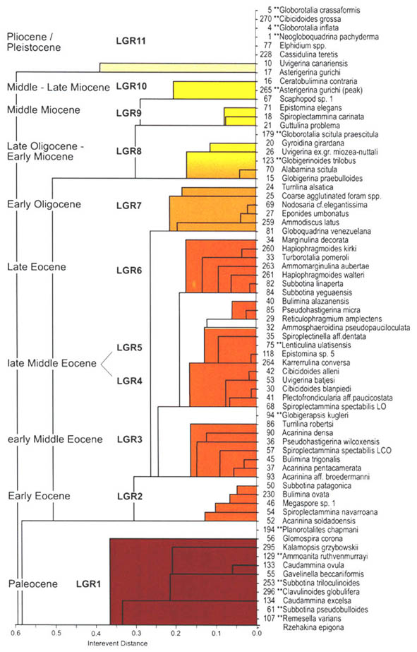 The evolution of alveolar structure among the organically-cemented deep-water agglutinated foraminifera took place concurrently along several lineages, in different oceanic basins during the mid to late Paleocene. Oceanic organic productivity as indicated by the ?13C ratios of pelagic carbonate was increasing steadily during the Paleocene (Corfield et al., 1991). Increased levels of sea-floor organic flux would have resulted in enhanced oxygen minimum zones below the thermocline and low values of oxygen saturation in the deep ocean. During the middle part of the Paleocene, the Atlantic Ocean became poorly oxygenated (Mountain et al., 1992), resulting in the deposition of dark coloured sediments in the deep basins. If the evolution of complex avleolar structure was a morphological adaptation to life in a poorly oxygenated environment, it is reasonable to assume that this evolutionary trait would evolve independently in different species. Several studies have pointed out the polyphyletic nature of the earliest Cenozoic cyclamminids (Berggren & Kaminski, 1990; Charnock & Jones, 1997), yet the group as a whole still suffers from a lack of detailed morphometric studies that would serve to document and understand the nature of its evolution. The single fact that is becoming increasingly well established is the observation that different species have evolved in different marginal basins of the North Atlantic during the Paleocene (Kaminski & Crespo de Cabrera, 1999).