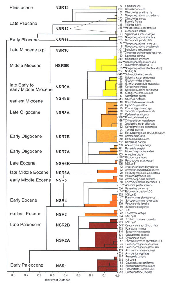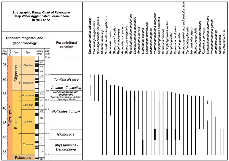 The traditional zonal schemes proposed for Tethyan and North Atlantic DWAF were based on first and last occurrences of characteristic taxa (e.g., Geroch & Nowak, 1984, King, 1989). Other zonal schemes have made use of a combination of first and last occurrences as well as abundance maxima (e.g., Olszewska, 1997). It is becoming increasingly apparent that the important oceanic events of the Paleogene have been an important instrument of benthic faunal change in the deep ocean. Quantitative analysis of Deep-water Agglutinated Foraminifera (DWAF) assemblages from key ODP sites in the North Atlantic reveal the presence of stratigraphically-significant abundance maxima, that may be useful for correlating sedimentary sequences deposited beneath the CCD. For the purpose of this summary, the DWAF record from ODP Hole 647A in the Labrador Sea was re-studied and abundances were recalculated by excluding calcareous benthic foraminifera (Fig. 45). This hole is a key locality, as it provides direct calibration of the DWAF biostratigraphy to the standard chronostratigraphy. A second important locality for the calibration of the acme events is the Contessa Road section, where several acme events are developed to a greater or lesser extent. These acmes, in turn can be traced to the eastern Atlantic ODP sites (Kuhnt & Collins, 1996; Kuhnt & Urquhart, 2001) and to the Polish Carpathians (Olszewska, 1997, Bąk, 2004).