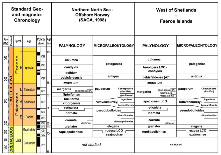 Figure 44. Summary of Paleogene zonal schemes described in different regions, arranged approximately from south to north.