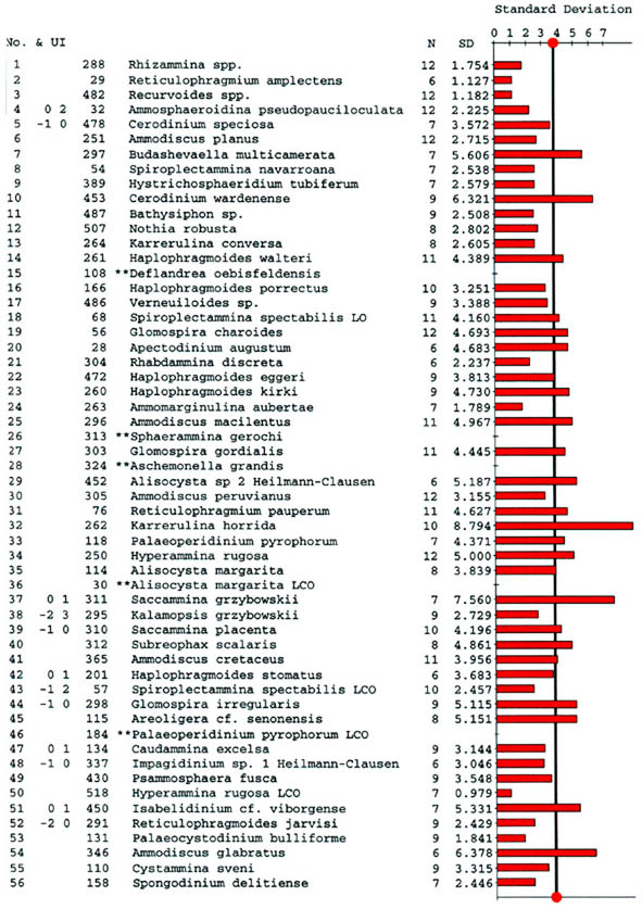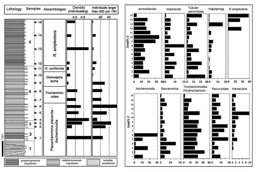 The stratigraphic significance Spiroplectammina spectabilis is not unequivocal, because as is the case with Glomospira, the occurrence of this species seems to be linked with the trophic continuum. Spiroplectammina is absent from the highly oligotrophic abyssal sites in the eastern Atlantic. Kuhnt & Collins (1996) did not record a single specimen of this species from the Iberian ODP sites, and Kuhnt & Urquhart (2001) reported rare specimens only from the Paleocene at Site 1068. It was also absent from our samples from the Paleocene-Eocene Talaa Lakrah section in Northern Morocco. However it can be very common at times, and forms distinct acmes in the Paleocene and Eocene at Gubbio. It can also be quite common in middle-upper Eocene samples from the Carpathian flysch. Bratu (1975) recorded an assemblage in lowermost part of the upper Eocene Bisericani Formation in the Romanian Carpathians. In the Atlantic, Spiroplectammina spectabilis is better known to form acmes in the Paleocene rather than in the Eocene. It is known as a "disaster species", occuring just above the Cretaceous/ Paleogene boundary at ODP Site 959 in the equatorial Atlantic (Kuhnt et al., 1998) and at Gubbio, Italy (Kuhnt & Kaminski, 1996). In the Barents Sea, its maximum occurrence is observed in the middle part of the Paleocene, while in the Central North Sea and in the Contessa section it is common in the upper Paleocene. Its occurrence in the deep-sea sites is most likely linked to an increase in sea-floor carbon flux. At Site 647 the biosiliceous flux increases uphole throughout the upper Eocene (Bohrmann, 1989), suggesting increasingly more eutrophic conditions.