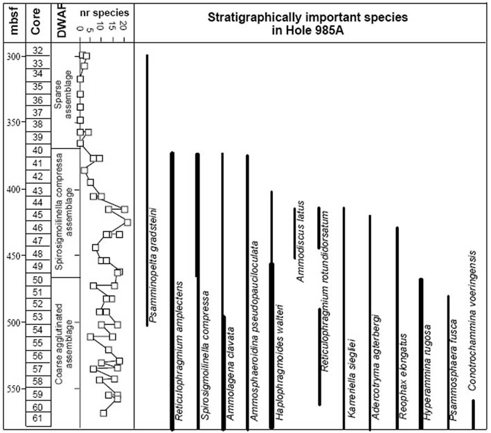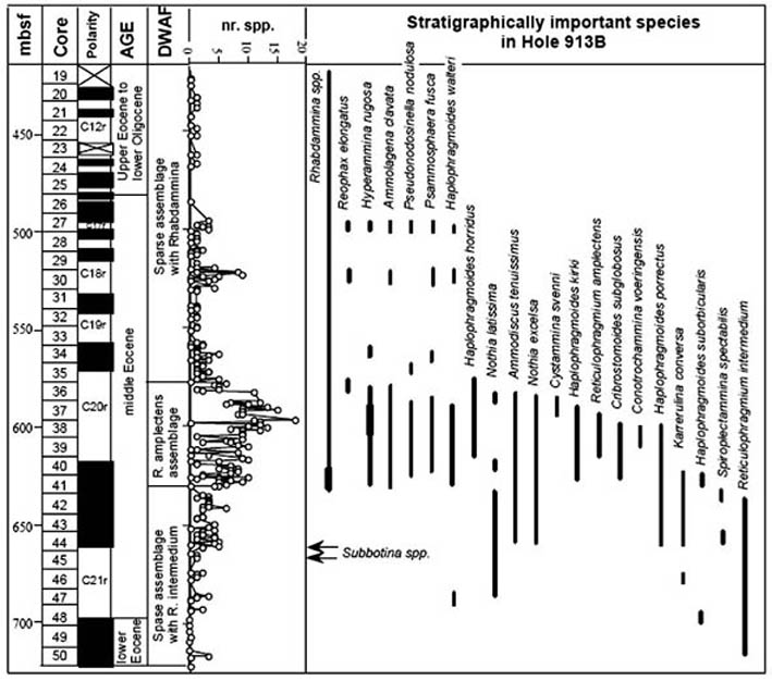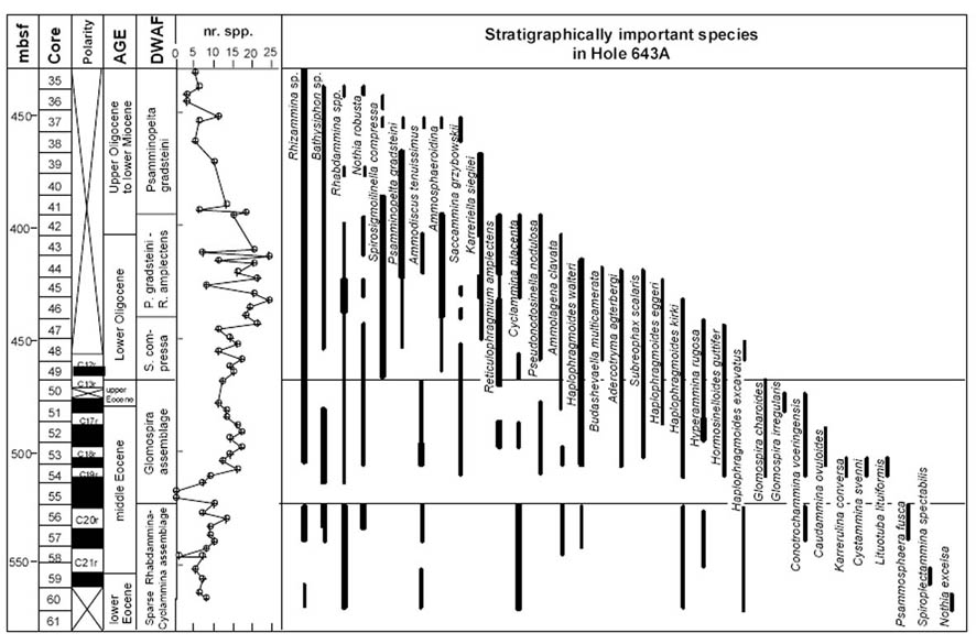 The diversity of agglutinated foraminifera declines abruptly across the Eocene/Oligocene boundary in Hole 647A. The Lower Oligocene at this site contains a depauperate DWAF assemblage, in sediments that are increasingly biosiliceous. At 237.1 mbsf the residual assemblage is comprised only of the species Spirosigmoilinella compressa and Psamminopelta gradsteini. A similar faunal change is known from the Oligocene of DSDP/ODP holes in the Central Norwegian Sea (Verdenius & van Hinte, 1983; Kaminski & Austin, 1999). This assemblage appears to be restricted to the northern North Atlantic.