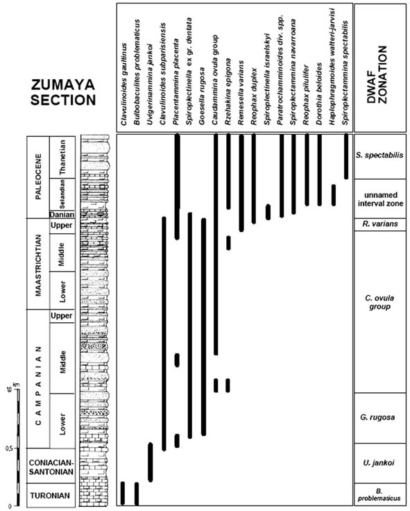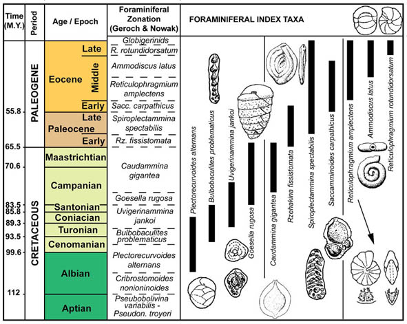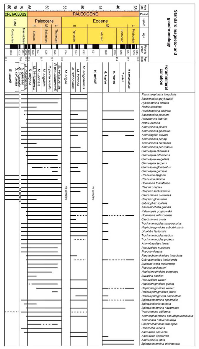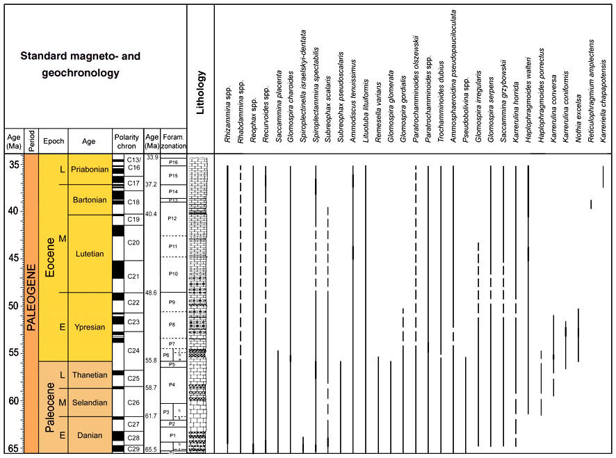 Reticulophragmium amplectens is one of the most widely known species described from the Carpathian flysch, and has been reported from Poland, Slovakia, Moravia, the Ukraine, and Romania by numerous authors. Reticulophragmium amplectens figures prominently in most zonal schemes using agglutinated foraminifera, both within the Carpathians and in other regions. In Poland, its first occurrence was reported in the Early Eocene (Zone NP12) by Olszewska & Smagowicz (1977). Its total range in the Polish Carpathians was given as Early to Late Eocene by Morgiel & Olszewska (1981), and its partial range and peak occurrence characterises the Middle Eocene Cyclammina amplectens Zone of Geroch & Nowak (1984). In Moravia, the first appearance of abundant R. amplectens was reported by Hanzlíková (1983) from Zone P10 based on the occurrence of Acarinina densa, A. pentacamerata, and M. aragonensis. In the central North Sea, King (1989) used the LCO (last consistent occurrence) of R. amplectens to define the upper limit of his Zone NSA4 (R. amplectens Zone), which he regarded as Early to Middle Eocene. The middle Eocene R. amplectens acme is also found at the deep Norwegian Sea Sites 643 and 913 (Kaminski et al., 1990; Osterman & Spiegler, 1996), and it characterises the top of the Torsk Formation in the Western Barents Sea (Nagy et al., 1997).