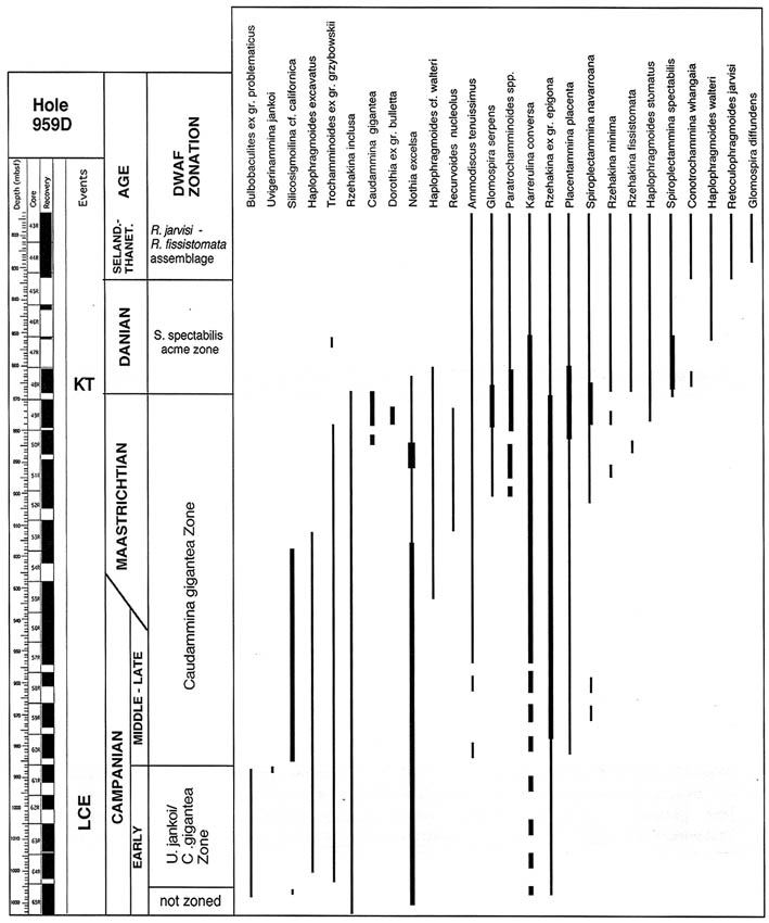 This second Glomospira acme is clearly present in the data from Hole 900A, where it is present as the most abundant non-tubular taxon in Sample 900A-70R-2, 57-59 cm (Kuhnt & Collins, 1996). This sample coincides with the FO of Reticulophragmium amplectens at this locality. Small numbers of Glomospira still occur at ODP Site 643 on the Vøring Plateau (Kaminski et al., 1990), but none were found at more northerly Site 913 in the East Greenland Basin (Osterman & Spiegler, 1996).