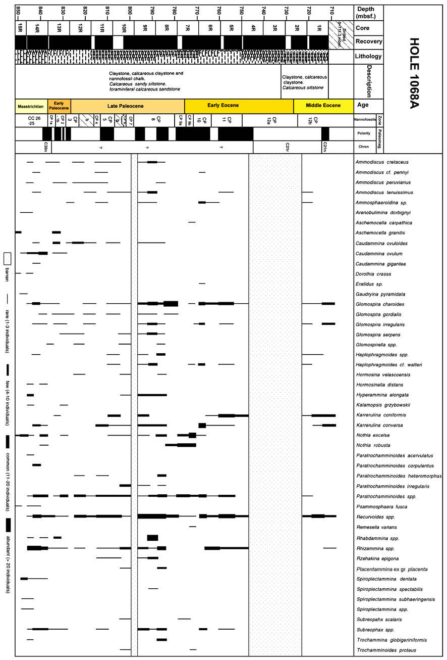 The acme of Glomospira charoides seems to be of use for stratigraphic correlation across the P/E transition in deep-water settings. Although not accurately dated, this is probably the same event that is present over a 12-m interval in ODP Hole 900A, and over a 3-m interval in Hole 897C off Iberia. Although the base of the Eocene was not recovered at Site 1067, a maximum in Glomospira is found in Cores 1067A-11R and -12R, which is dated as early Eocene (Zones NP11-12). A remarkable bloom of G. charoides occurs in the Trabakua Pass section in the Basque basin, Spain, where it forms 50% of the assemblage in the lowermost Eocene (Coccioni et al., 1995; Orue-Extebarria et al., 1996). The Glomospira-Ammodiscus assemblage reported by Kaminski et al. (1996) from the Paleocene-Eocene Talaa Lakrah section in Northern Morocco might be coeval. In the Polish Carpathians, the event is widely distributed and it constitutes the basal Eocene zone in the DWAF zonation of Olszewska (1997).
