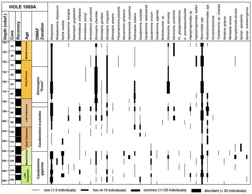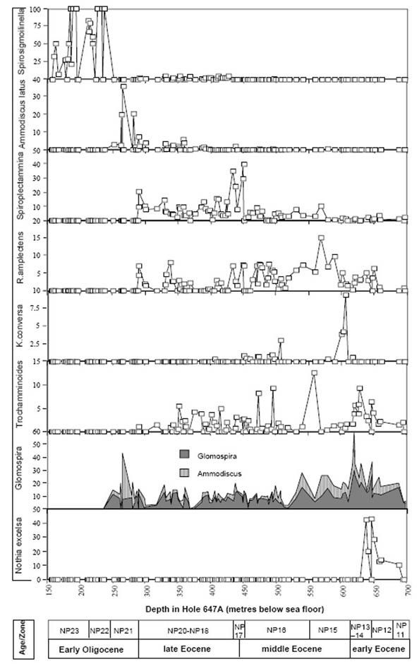Nine DWAF acmes are recognised in the Eocene to lower Oligocene at Site 647 and at other Atlantic and Norwegian Sea sites (Sites 959, 985, 1047, 1048). These are: The "Strangelove Ocean" spiroplectamminid acme, The PETM Glomospira Acme, a lower Eocene N. excelsa acme, an early/middle Eocene glomospirid acme, a Karrerulina acme, a middle Eocene Reticulophragmium amplectens acme, a middle/late Eocene Spiroplectammina acme, a latest Eocene-early Oligocene Ammodiscus latus acme, and an early Oligocene Spirosigmoilinella acme. Some of these acmes can be correlated with similar events occurring at onshore