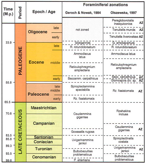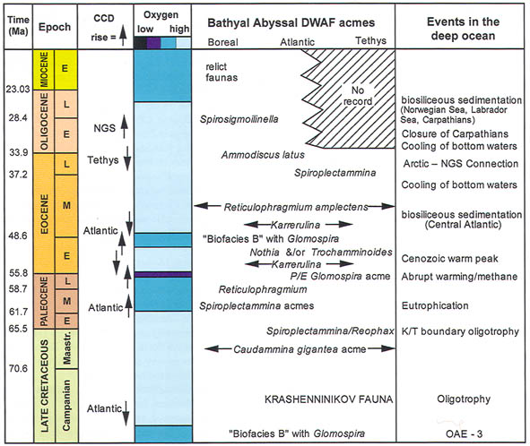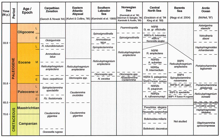 The preceeding discussion of the studied localities should provide an overview of the use of DWAF for constructing local stratigraphic zonations and for correlation of deep marine sequences. The main point that can be made is the fact that DWAF may be very useful for intra-basinal stratigraphical correlations. However, for the purpose of inter-regional correlation, environmental factors such as palaeobathymetry and the trophic continuum must be taken into account before we attempt long-distance correlations. The silled basins such as the Norwegian Sea, and to some extent the various flysch basins of the Alpine-Carpathian area have their own depositional histories and degrees of faunal endemism. Both the Geroch & Nowak "Tethyan" zonation and the Gradstein et al. "Boreal" zonations reflect basinal history, and have some events that are unique to a given region. However, there are also some interesting communalities between the Tethys and the Boreal basins that may be related to inter-basinal marine conections or to oceanic events of a more global nature. Examples of the latter are the Cretaceous/Paleocene boundary event, the Paleocene/Eocene boundary, and the Eocene/Oligocene boundary events. Each of these events resulted in important faunal changes among the DWAF in terms of extinctions and/or the occurrence of a particular biofacies. A summary of Paleogene zonal schemes from the western Tethys to the Arctic Ocean is given in figure 44.